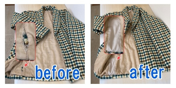 ガウン裏地破れの対応事例 2023.08.24 カテゴリー: 修理・リペア タグ: キズ・穴・やぶれ・ほつれ修理 📸ガウン・裏地破れの対応事例 📝ガウンの裏地の破れをお直しさせていただきました。表地は柔らかい生地で多少の引っ張りは耐えますが、裏地は伸縮性が無いので縫い目から目裂けが始まり、最後は破れを起こします💦着用の際に気を付けていても家具に引っ掛けたり、寄りかかって力が加わったりしますと破れが生じます。目裂けの段階でお直し出来ればとは思いますが、破れになって気が付くことが多いので、時々裏地のチェックもお願いします。m(__)m