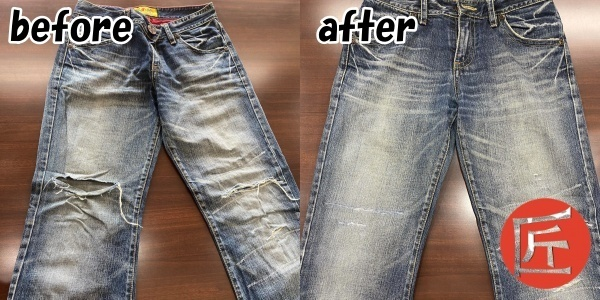 ジーンズの破れ修理 2023.08.27 カテゴリー: 修理・リペア タグ: ジーンズリペア 📸ジーンズの破れ修理👖 📝膝の傷みが進んだジーンズ😣ジーンズリペアにて再び大活躍♪ リペアのことはみつみにご相談くださいね‼️