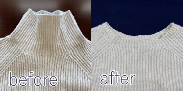 セーター襟の形変更の対応事例 2023.08.24 カテゴリー: 修理・リペア タグ: リメイク 📸セーター襟の形変更の対応事例 📝セーターの襟をタートルネックから編み目をほどいて短い幅にしてくさり編みで端を整えました。カシミア素材と色が気に入ったのに襟の丈だけが気になるとのご相談にお応えして、丸首をご提案いたしました。早速着ていただき、「良かったです」と喜んでいただけました。