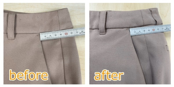 パンツ・ウエスト詰めの対応事例 2023.08.27 カテゴリー: 修理・リペア タグ: キズ・穴・やぶれ・ほつれ修理 パンツ・ウエスト詰めの対応事例 パンツのウエストを4センチ詰めました。ウエストが緩く、安全ピンでサイズ調整して着用されていたお客様。着用の度にピンで止めるのは危ないけれど、ベルトは使いたくないのでウエストのサイズ直しをお願いしたいとのご依頼でした。ベルトを使って着用されてもしわができる場合もありますよね。丁度いいサイズでお召いただけるようになり喜んでいただけました。
