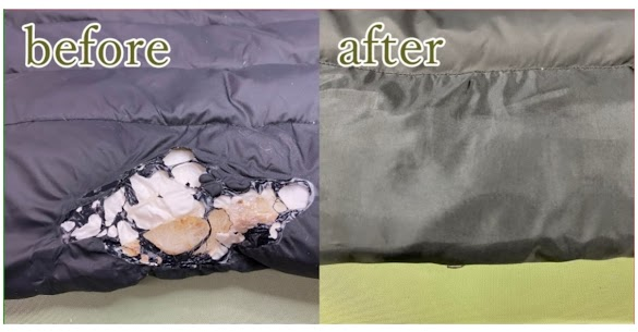 ダウンパックの焦げを取り除き生地を縫い付けて補修後に表生地を後ろ身頃裾の穴を包んで補修させていただきました。
