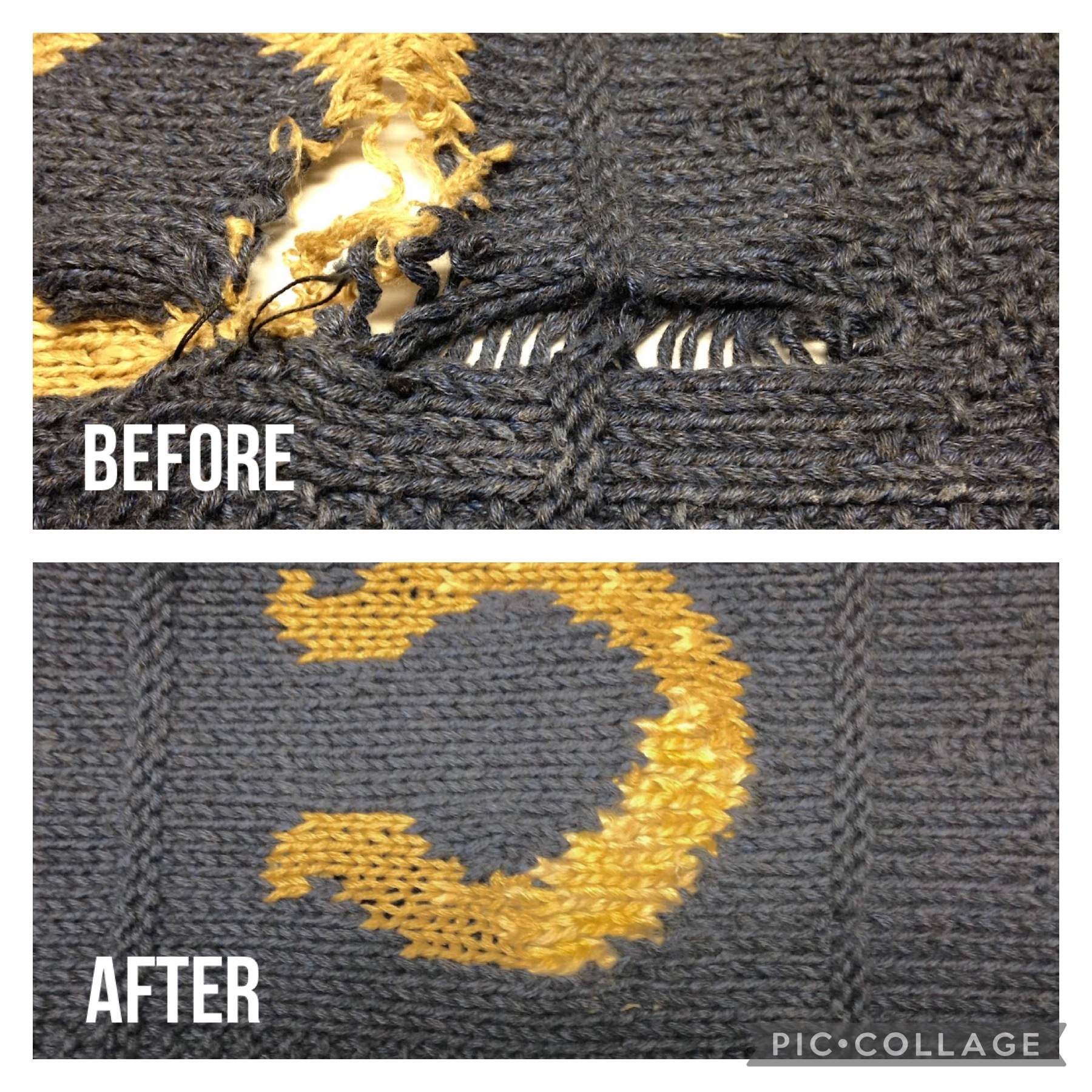 📸ニットの破れと目落ちの修理をさせていただきました🪡 📝ニット製品は、小さな穴でも着用やクリーニングで穴が広がっていきます💦あまり広がらないうちに早めの修理をお勧めします✨