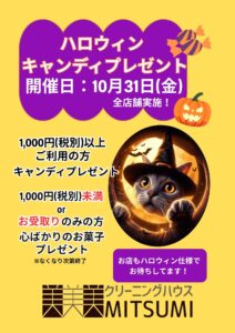 🎃ハロウィンキャンペーン開催のお知らせ🎃 10月31日(金)、クリーニング店にもハロウィンがやってきます!この日だけのちょっと特別なイベントをご用意しました🧡 🍬キャンディープレゼント! 当日、1,000円以上(税込)ご […]