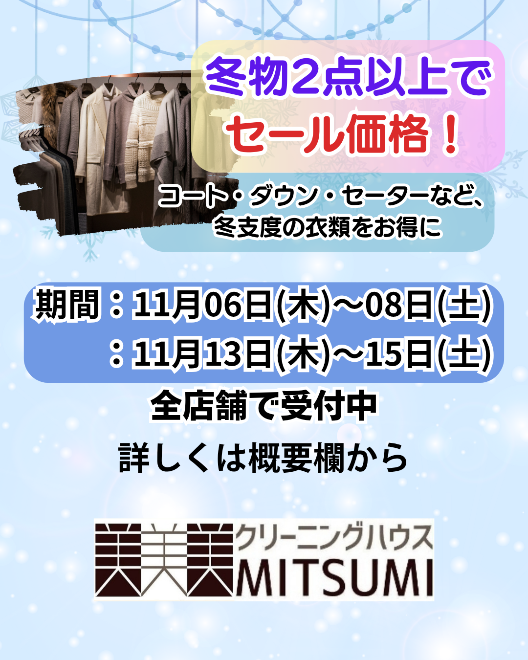 🧥冬支度にぴったりのクリーニングセール開催! 寒さが近づいて、そろそろコートやダウンを出す季節ですね。クローゼットを開けてみたら、「去年洗わないでしまってたかも…」そんな方も多い時期です。 今年の冬も気持ちよくお出かけで […]