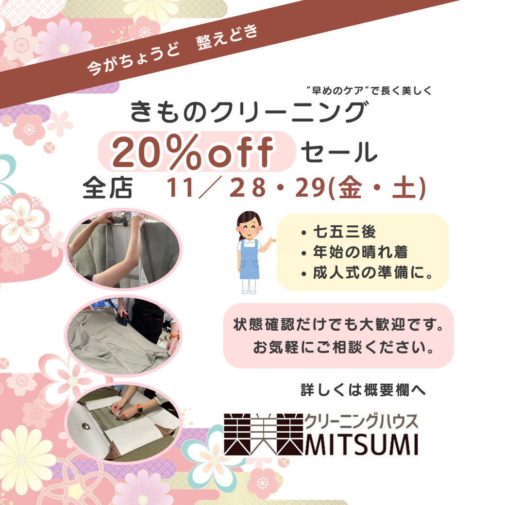 きものクリーニングセール 11/28・29(金・土)2日間限定 振袖・訪問着・七五三「きもの」の丸洗い・しみ抜きは専門店へ 七五三のお祝いが終わり、年末年始の晴れ着や成人式の準備が始まるこの時期。「そろそろお手入れしない […]