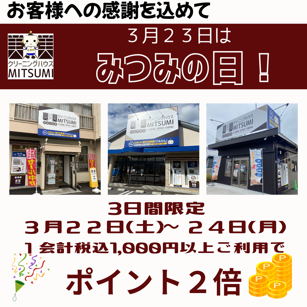📢 3月23日はみつみの日! 🧺✨ お客様に感謝を込めて【ポイント2倍キャンペーン】を開催します! 🗓 期間:3月22日(土)~3月24日(月)🛍 対象:全店舗の店頭にてクリーニング1会計税込¥1,000以上ご利用のお客 […]