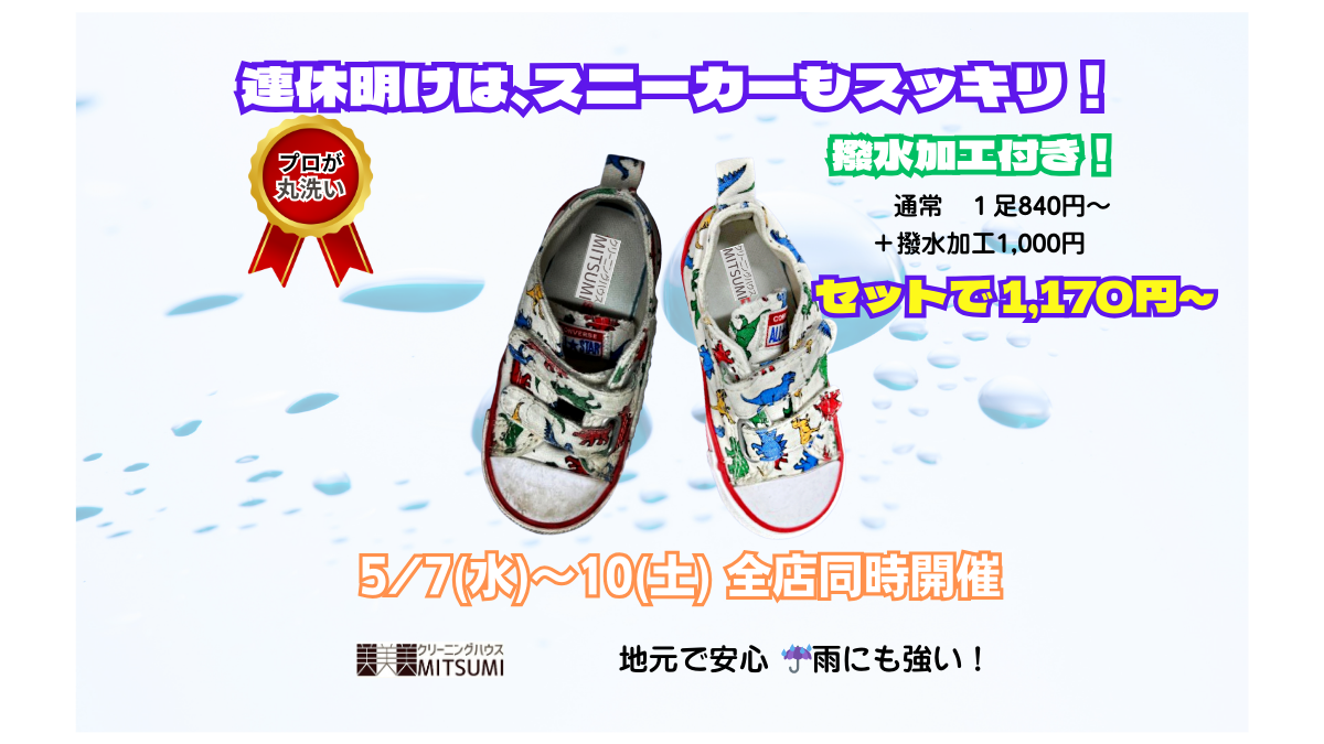 連休明けは、スニーカーもスッキリ! 👟連休明けは、スニーカーもスッキリ!スニーカークリーニングセール全店同時開催!🗓期間:5月07日(水)~5月10日(土) 落ちにくい汚れや黒ずみも、プロの手で気持ちよくリフレッシュ✨洗 […]